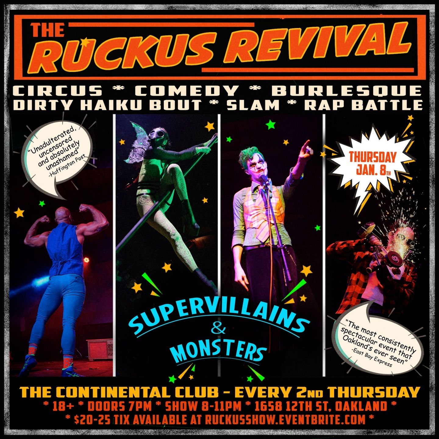 Ruckus Revival is “the largest, longest running variety show in the Bay Area.” It’s part circus, part goth-cyperpunk and all mixed together with fire. If you miss this one, next show is 2/12. | Every 2nd Thursday of the month, 8-11pm. The Continental Club, Oakland. See Tickets →